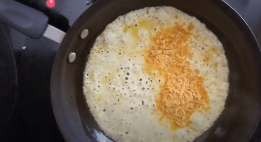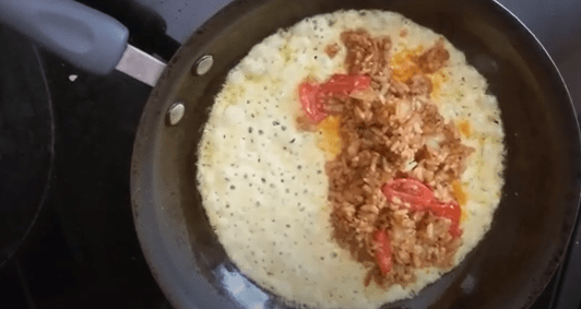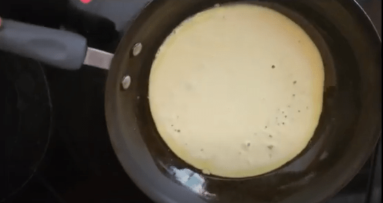 After that, grease up that pan well so the egg doesn’t stick, heat up that oil medium heat, and pour egg mixture into the pan. Swirl it around if necessary to cover the bottom fully.