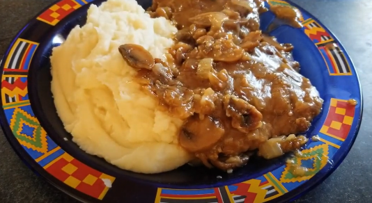 | For the Steak Dry Ingredients: *1/4 cup panko *1 tsp salt *1 tsp pepper *1/2 tsp oregano or Italian seasoning *1/2 packet of dry onion soup mix Wet Ingredients: *1 vegan egg (I used a flax egg) *2 tsp Worcestershire sauce *2 Tbsp milk (I used oat) *1 lb meat replacement grounds (I used Beyond) *1 to 2 Tbsp cooking oil for the pan, not in the mixture (I used vegetable) Gravy *1 or 2 Tbsp butter (personal preference, I use 2) *1/4 to 1/2 onion, chopped (personal preference, I use 1/2) *10 oz of sliced mushrooms, can use frozen *2 to 4 cloves garlic, crushed (personal preference, I use 4) *2 Tbsp flour *1/2 packet dry onion soup mix *1 1/2 cups broth of choice (I used not beef broth) *Salt and pepper to taste Chop onions, mushrooms and prepare garlic (or chop, if preferred). Get flax egg ready, set aside. Add all dry ingredients in a bowl for steak, mix well. Add in wet ingredients, mix all together well. Heat 1 to 2 Tbsp of cooking oil in a pan on medium heat, form steaks and carefully lay them into pan. Cook about 8 minutes, then flip and cook other side (check at about 5 minutes, second side will usually cook faster). Remove steaks from pan and sit aside. In the same pan without cleaning, add in vegan butter and melt it down, then add in onions. After a few minutes, add in mushrooms and cook until onions start to turn translucent. At that point, add in the garlic. Cook for a few minutes (about 3) so not to burn the garlic, then add half of broth. Sift in flour and the remainder of the dry onion soup mix, then add the remainder of broth. Stir and let gravy start to thicken (about 3 to 5 minutes), then add steaks back into the pan. Cook 15 to 20 minutes, occasionally carefully scraping along the bottom of the pan so nothing sticks/burns. |