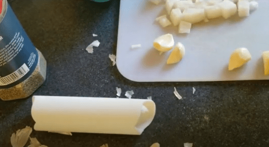 Then I’m going to chop up my onions and get my garlic cloves peeled and ready to press. (If you don’t have one of those garlic peelers that all you gotta do is press and roll, oh my god, get one. They’re amazing)