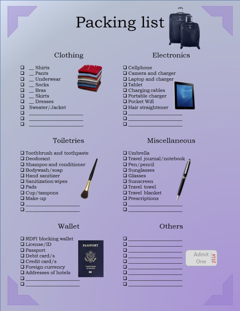 Hey there, I made some packing list PDFs that I wanted to share. There’s a generalized one for anybody, and then one that has more items pertaining to a more, as people say, “feminine” type (make up, straightener, maybe you menstruate because there’s packing for that, too).