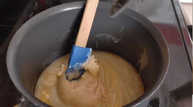 Over low heat, add your butter, salt and condensed milk, stir together and allow to melt down a bit.
