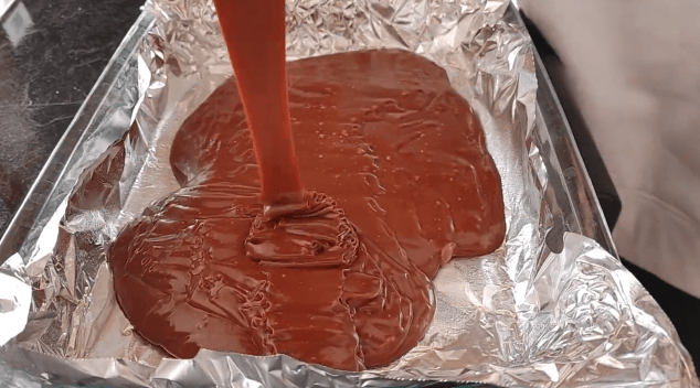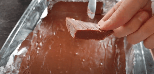 Prepare your baking dish first, that you’ll be pouring the fudge into for storing. I line my 9×13 baking dish with tinfoil (can also use parchment paper, can also use… nothing but a bit of cooking spray, too, just harder to clean in the end) and give it a light coating of cooking spray for easier removal of fudge pieces.