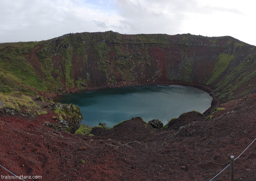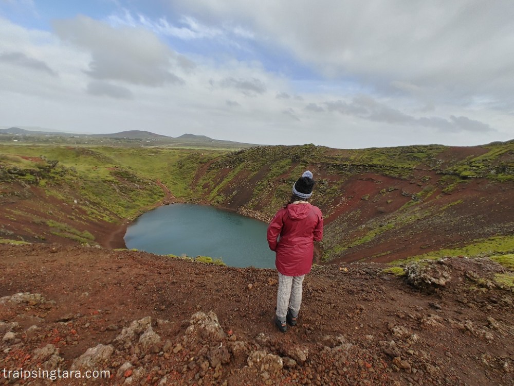 So yeah, my friend was soaked to the bone when we got back in the car and we travelled on down to Kerid Crater. To get here, go back the way you came to Gullfoss, but take a left at the fork to stay on Road 35 instead of going back to road 37. You’ll stay on 35 all the way until you get to Kerid Crater. There is a per person fee here of 400 ISK, and a booth at the trailhead where you can pay it.