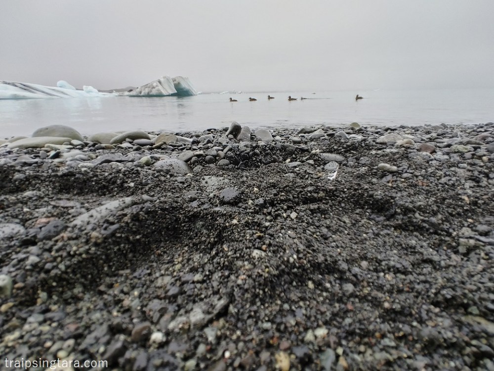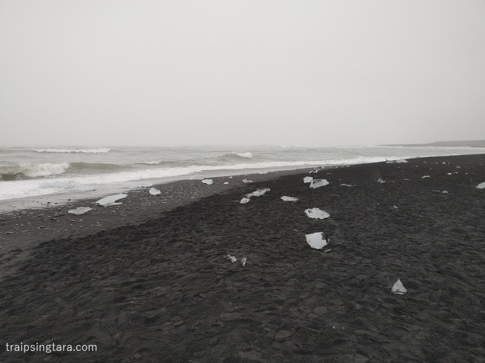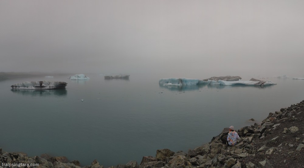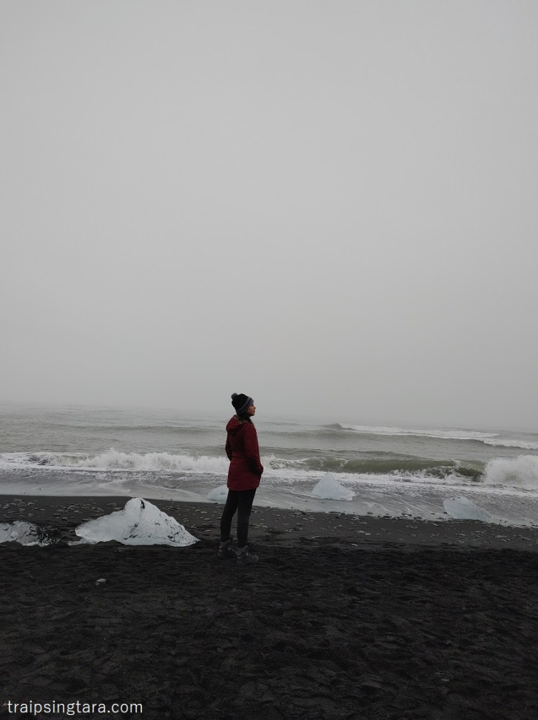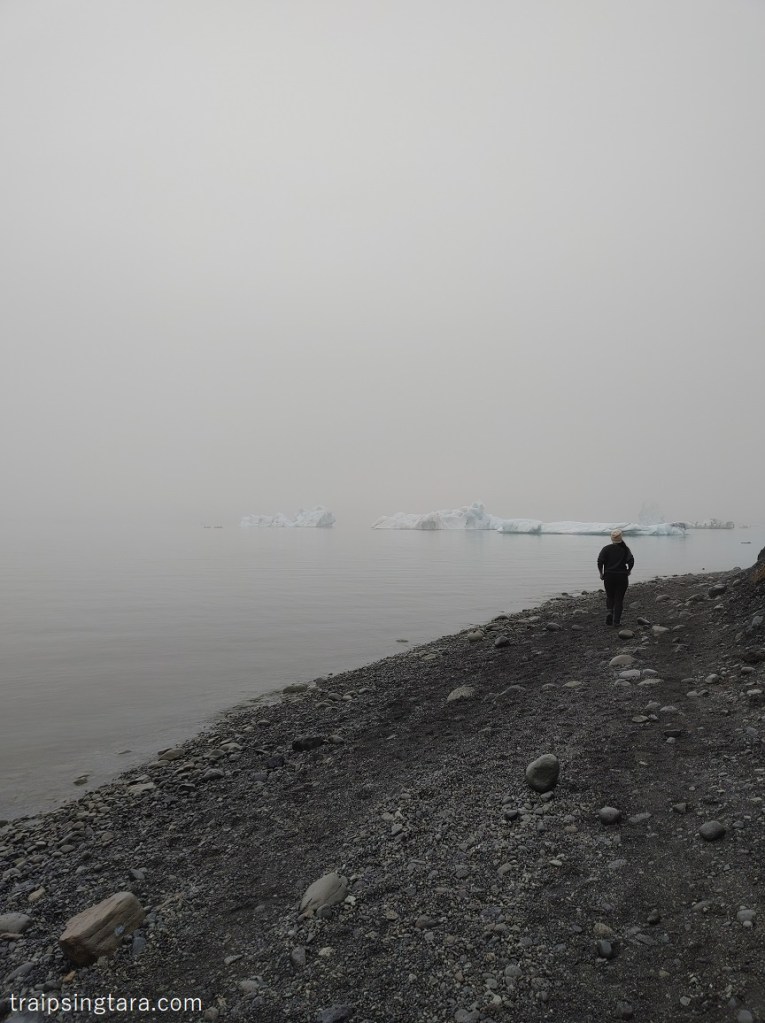 It was cold and very foggy, which prevented us from being able to see too far out into the ocean. But still clear enough to get a great picture of the ice pieces floating onto shore.