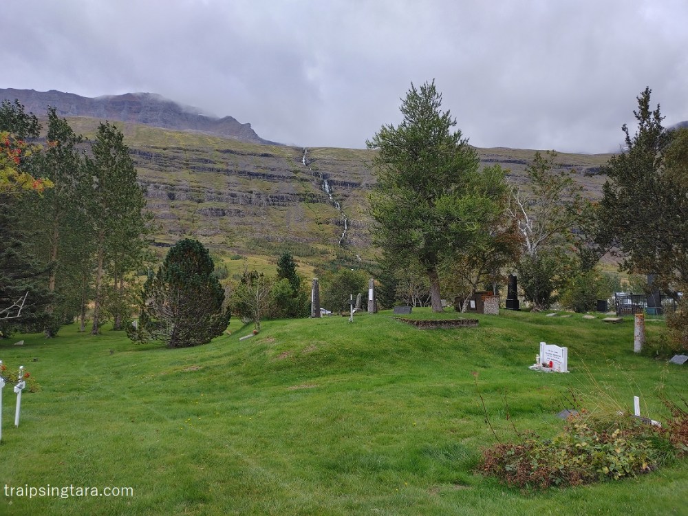 Our drive here was almost entirely rainy. It was a dreary drive, fog covering much of the landscape, unfortunately. But we made it safely from point A to point B, and because we couldn’t really see what was beyond the road, I guess it saved us a lot of time from not wanting to pull over and explore every so often. It may take you longer than us, if you’re able to see what’s beyond the road. It rained really hard all night, here. There wasn’t much close by, so we made us some PB&J and filled up on grocery store snacks that we’d grabbed in Akureyri. If the weather isn’t bad for you, I would drive the few minutes into the nearby town and explore there. It was a cute seaside town and had an interesting looking church.